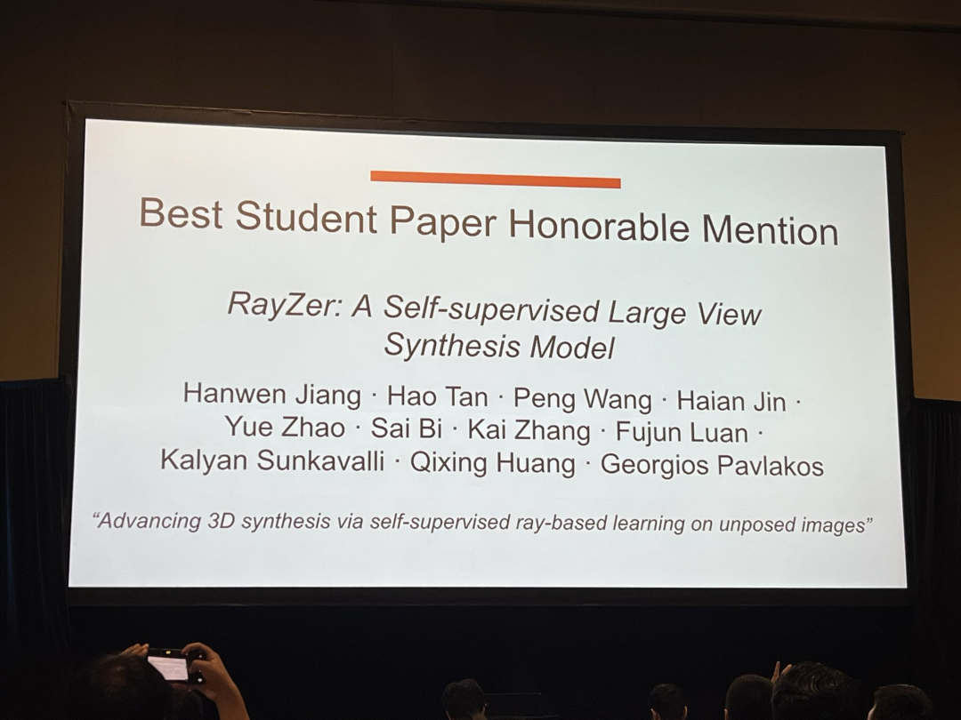 此外,来自德州大学奥斯丁分校的论文《RayZer: A Self-supervised Large View Synthesis Model》获得了最佳学生论文提名奖。