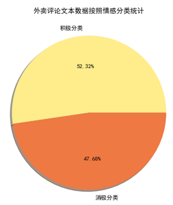 通过外卖评论文本按情感分类统计图可以得出,积极情感分析积极分类占比为 52.32%,超过了一半。这表明在收集的外卖评论文本数据中,大多数消费者对外卖服务、餐品等方面持有较为满意、认可的态度。说明外卖商家在整体上能够满足消费者的需求,在餐品质量、配送服务、包装等方面有较好的表现,从而使得消费者给出积极评价。消极情感分析消极分类占比为 47.68%,虽然略低于积极分类,但占比也相当高。这反映出仍有相当一部分消费者对外卖体验存在不满,可能在餐品口味、配送速度、服务态度等方面存在问题,导致他们给出负面评价。商家和平台需要重视这些消极评价,从中找出问题根源,例如是菜品不合口味、配送延迟,还是服务态度欠佳等,进而有针对性地进行改进。