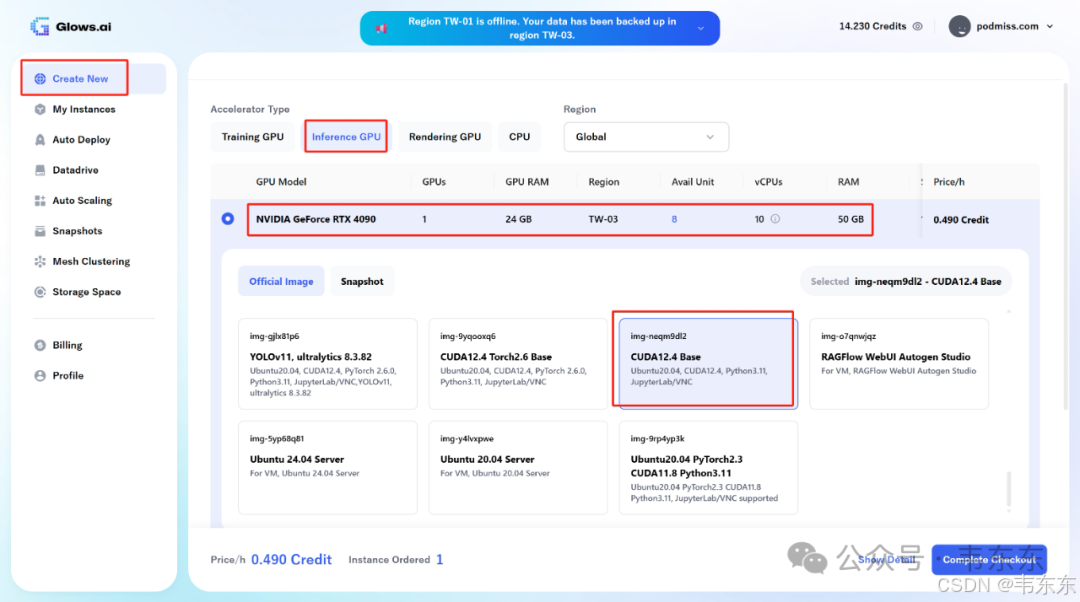 这种方法适用于没有本地 GPU,需要租用云端资源的盆友。以下步骤以glows.ai平台(不是软广)为例。(主流云厂商没找到 4090 的分时租赁)