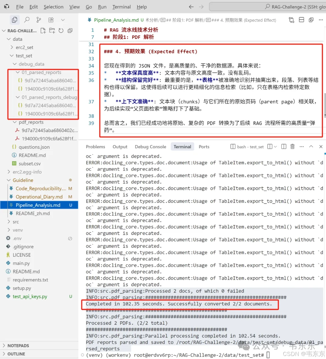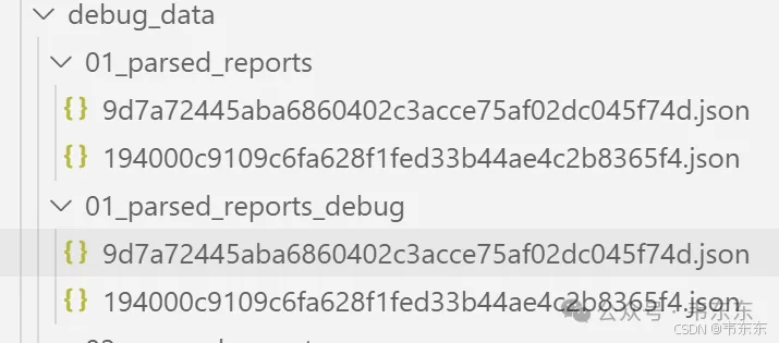这一步会利用 GPU 对 PDF 进行解析,并把结构化结果存为 JSON 文件。命令成功执行后,解析的文件会出现在新建的 debug_data/parsed_reports/目录中。