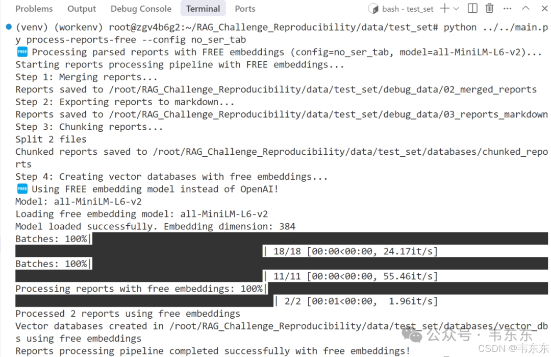 这是最后一步,模拟用户提问,并使用前面构建的 RAG 系统来生成答案。系统会处理测试集中的问题,并最终在 debug_data/相应目录中生成包含答案的 JSON 文件。