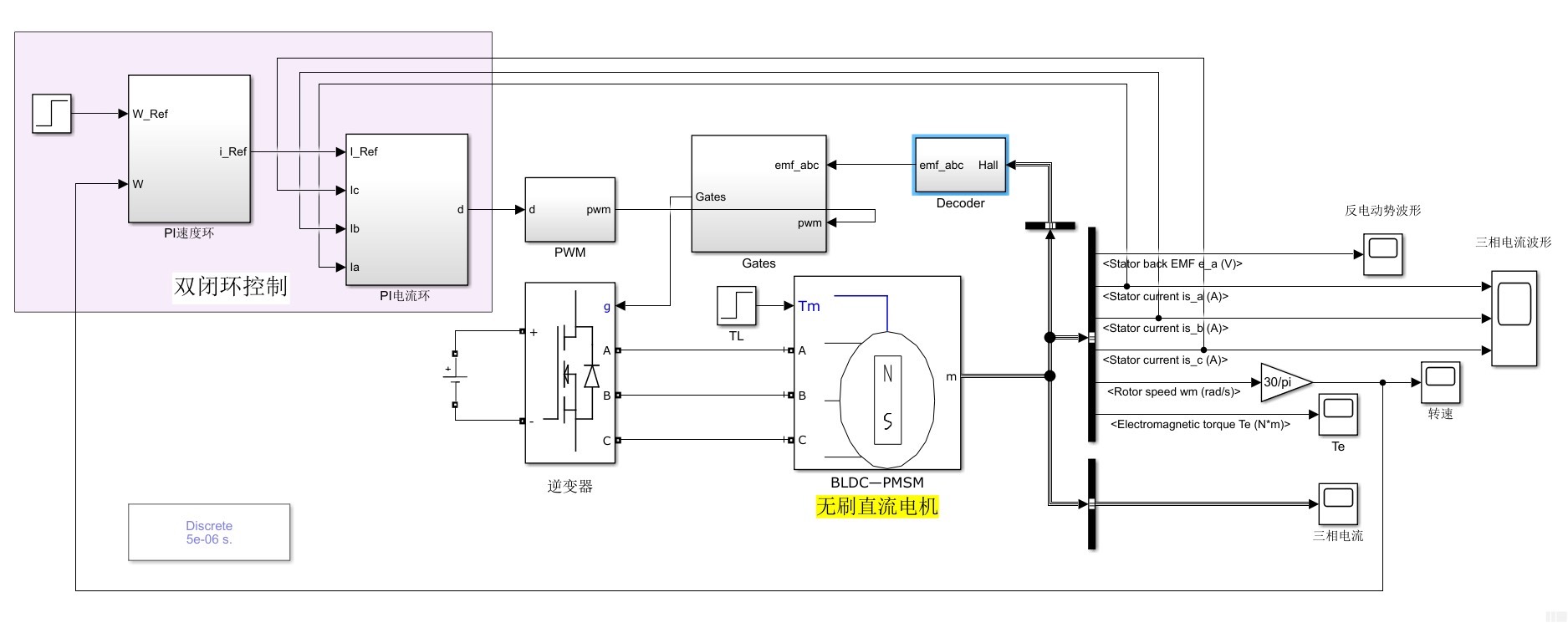 这次的仿真聚焦于 BLDC 无刷直流电机的双闭环控制。所谓双闭环,一般指的是速度环和电流环。速度环用于控制电机的转速,使其跟踪给定的转速值;电流环则是为了确保电机运行时的电流在合理范围内,同时也对速度环起到辅助调节的作用。