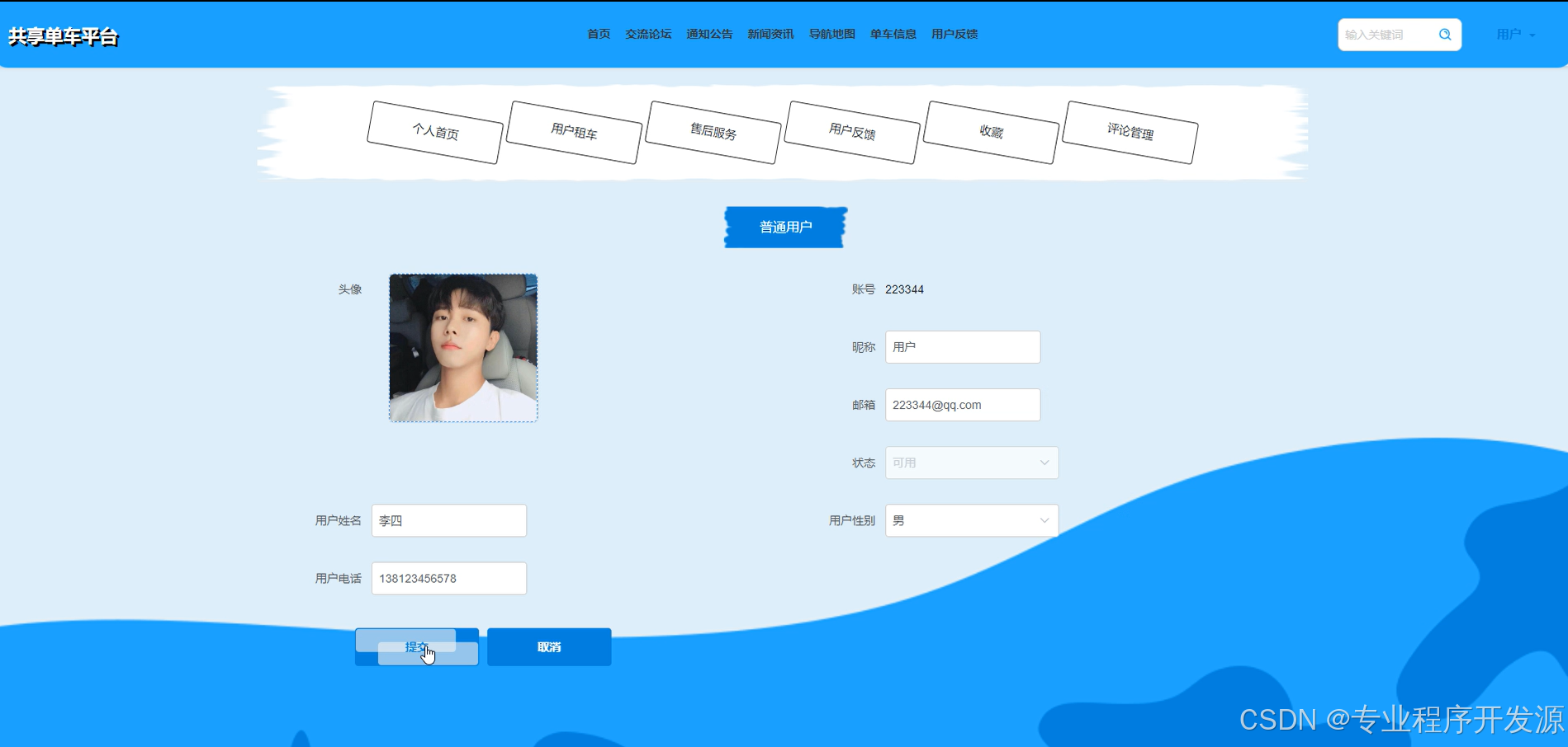 - 普通用户:可以在线交流沟通,浏览新闻和单车信息列表,搜索单车信息,租车租车支付单车信息,查看订单状态,评价和反馈交易等功能。