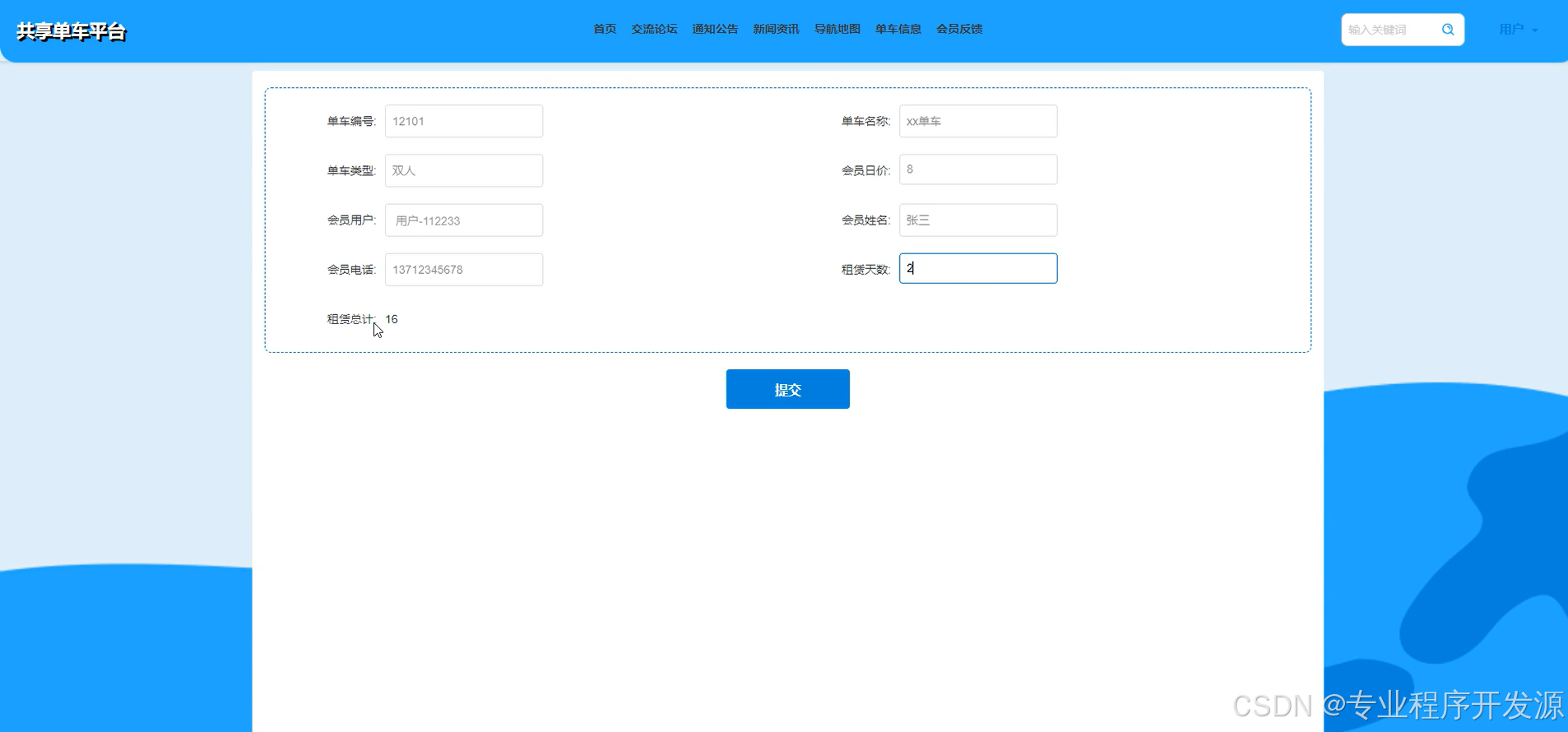 - 会员用户:可以在线交流沟通,浏览新闻和单车信息列表,搜索单车信息,租车租车支付单车信息,查看订单状态,评价和反馈交易等功能。