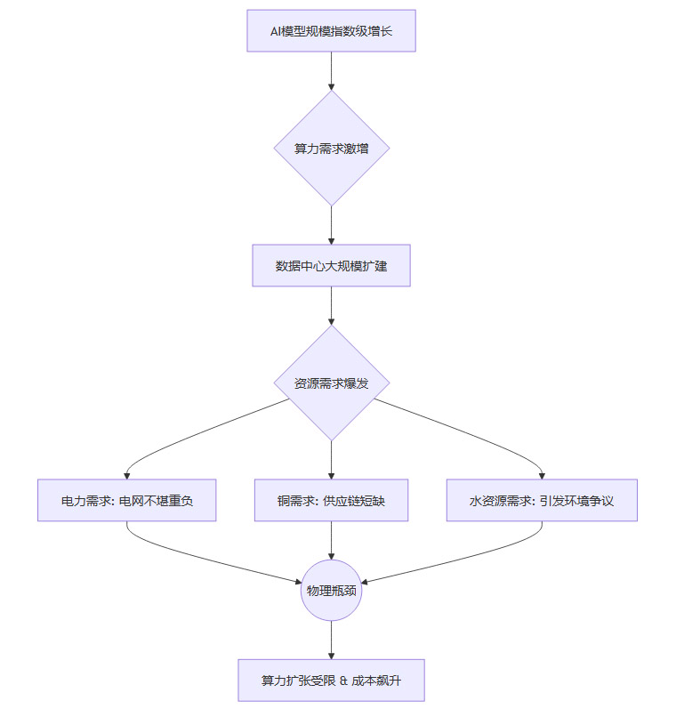 这个流程图清晰地展示了,AI 的“无限智能”梦想,最终必须面对物理世界有限资源的“硬约束”。技术叙事中的指数级增长,正在撞上现实世界的基础设施天花板。