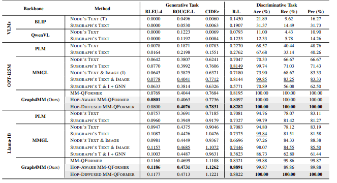 本表提供了在不同预训练模型(PLMs、VLMs)和多模态图学习方法(MMGL)上,Graph4MM 框架在生成任务和判别任务中的性能对比结果。表中展示了使用不同输入设置(如仅节点文本、节点文本与图像、子图文本、子图文本与图像)时,各模型在 BLEU-4、ROUGE-L、CIDEr(生成任务指标)以及准确率、召回率、精确率(判别任务指标)上的表现。 从表中可以看出,Graph4MM 在所有设置下均优于或至少与现有的预训练 VLMs、PLMs 和多模态图学习方法(如 MMGL)持平。特别是,Graph4MM 在引入 Hop-Diffused Attention 和 Hop-Aware Attention 后,能够更好地捕捉多跳结构信息,从而在生成和判别任务中均取得了显著的性能提升。例如,在使用 OPT-125M 和 LLaMA-1B 作为后端时,Graph4MM 的 Hop-Diffused MM-QFormer 在 BLEU-4、ROUGE-L 和 CIDEr 等指标上均达到了最高值,显示出其在多模态学习任务中的优越性。