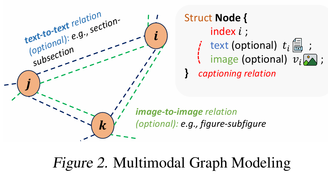 本图展示了多模态图的建模方式。图中定义了一个多模态图 G=(V,E,T,P) ,其中 V 表示节点集合,E 表示边集合,T 表示文本属性集合,P 表示视觉属性集合。每个节点 v i 可以包含一个唯一的索引、可选的文本属性 t v i 和可选的视觉属性 p v i 。边分为三种类型:文本到文本、图像到图像和文本到图像。图中通过示例展示了如何将一个节点(例如文档中的一个章节)及其相关的文本内容、图像和图像标题建模为图结构,其中节点之间的连接基于它们在文档中的语义关系和共现关系。这种图结构能够捕捉多模态数据之间的复杂交互关系,为后续的多模态学习任务提供了基础。