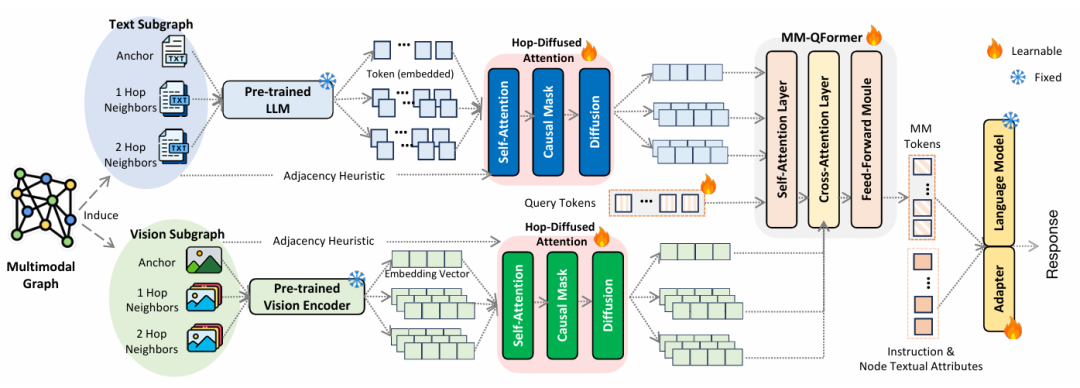 本图展示了 Graph4MM 框架的整体架构。该框架通过将多模态数据(文本和图像)建模为图结构,并利用图中的结构信息来增强多模态融合,从而提升多模态学习的性能。图中详细展示了框架的三个主要部分:文本子图、图像子图和预训练语言模型(PLM)的输入结构。在文本子图和图像子图中,框架通过Hop-Diffused Attention机制整合多跳邻居的结构信息,该机制利用因果掩码和扩散机制将图的拓扑结构信息融入到节点表示中。这种结构感知的注意力机制能够捕捉节点之间的复杂关系,同时避免过度平滑的问题。