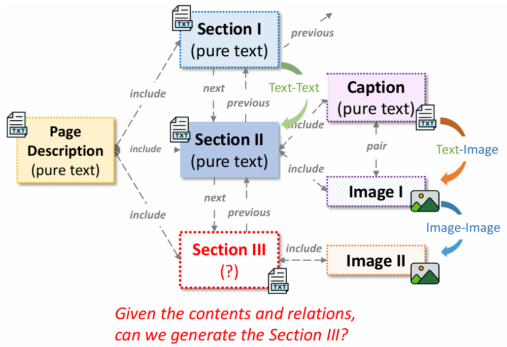 本图展示了多模态数据在文档中的复杂关系,其中章节、图像、标题和页面描述形成了一个结构化的图。图中通过箭头表示不同元素之间的连接关系,例如章节之间的层次关系、图像与文本的配对关系以及图像与页面描述的关联。这些关系构成了一个复杂的图结构,其中每个节点(如章节、图像)都可能与其他节点通过多跳连接相互影响。这种复杂的多模态交互关系是本文研究的核心,旨在通过图结构来更好地理解和生成文档中的内容。例如,给定章节的内容、图像及其邻近的上下文信息,模型需要生成缺失的章节内容(如Section III)。这一任务不仅需要理解单个模态内的信息,还需要跨模态的融合和多跳邻居的信息传递,从而体现出图结构在多模态学习中的重要性。