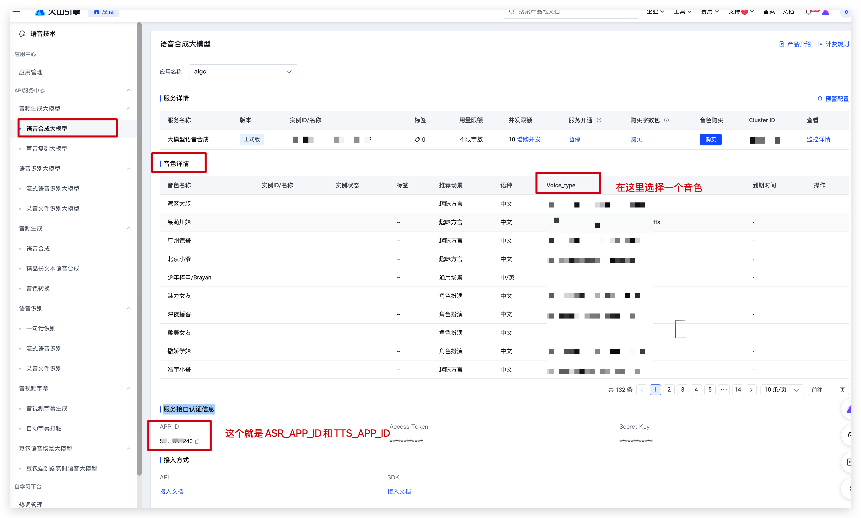 主要容易搞混的,第一个是 DEFAULT_VOICE_ID,这里要选择语音合成大模型的音色。
