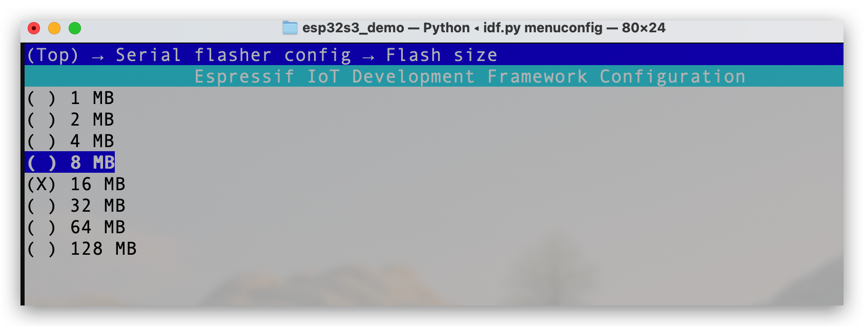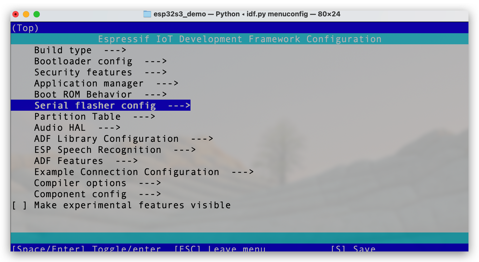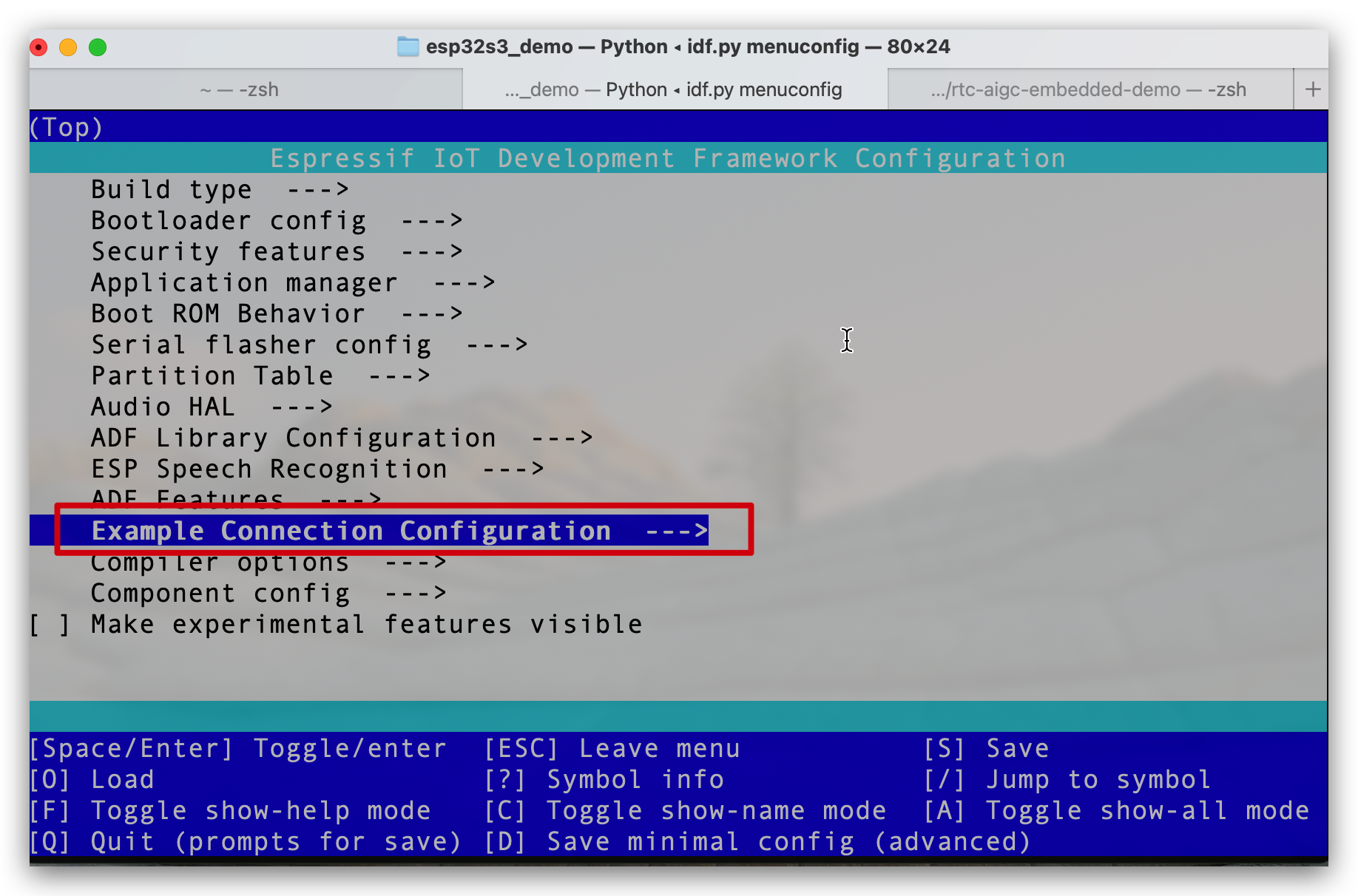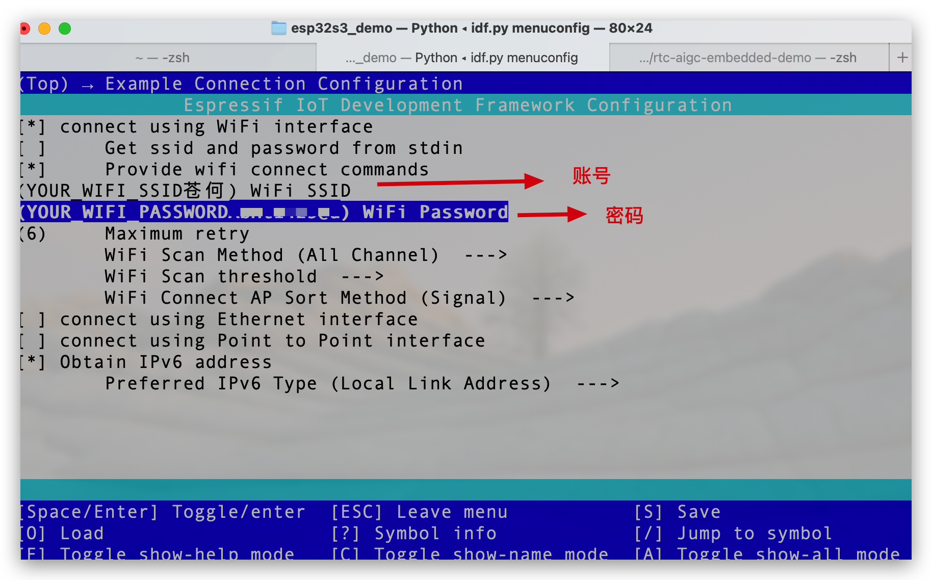 进入 Example Connection Configuration 菜单,在 WiFi SSID 及 WiFi Password 中填入你的 WIFI 账号和密码,保存并退出配置菜单。