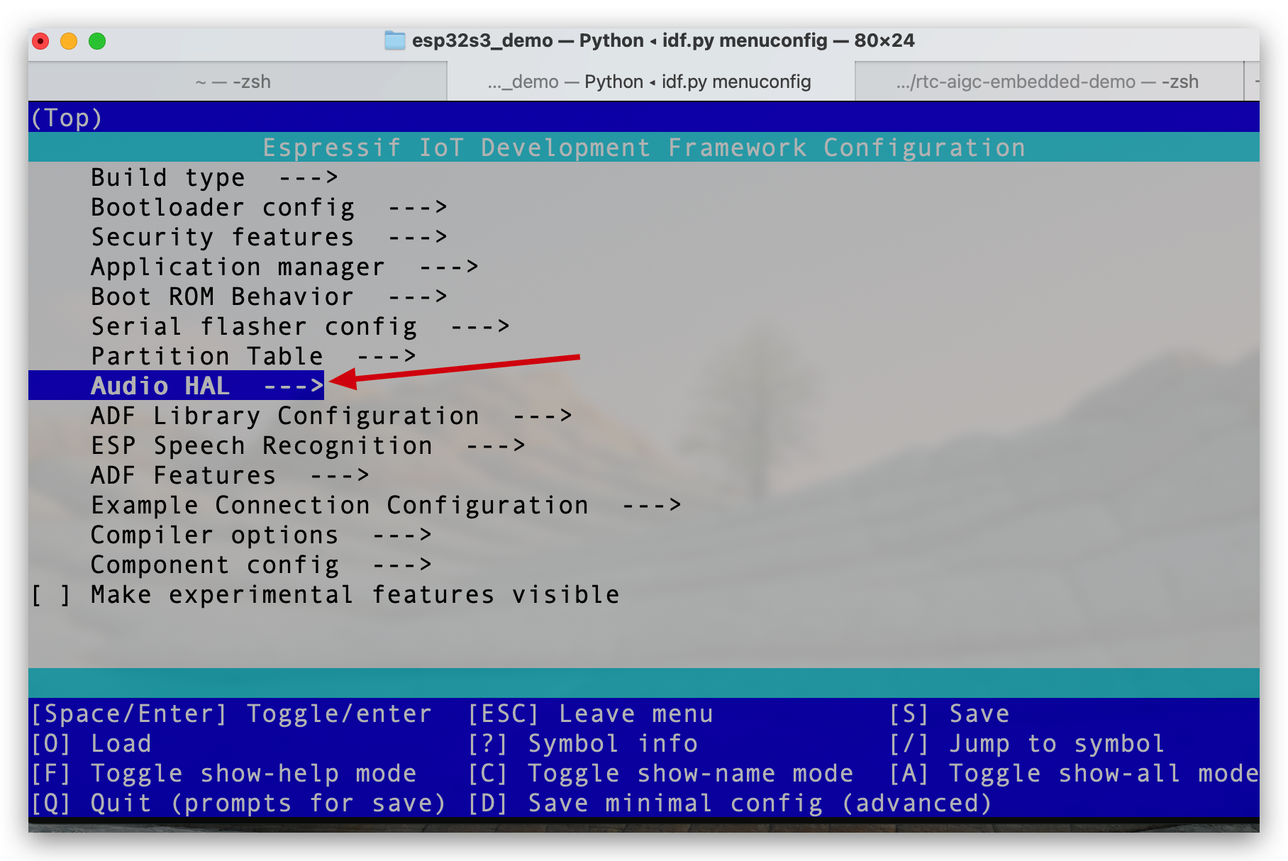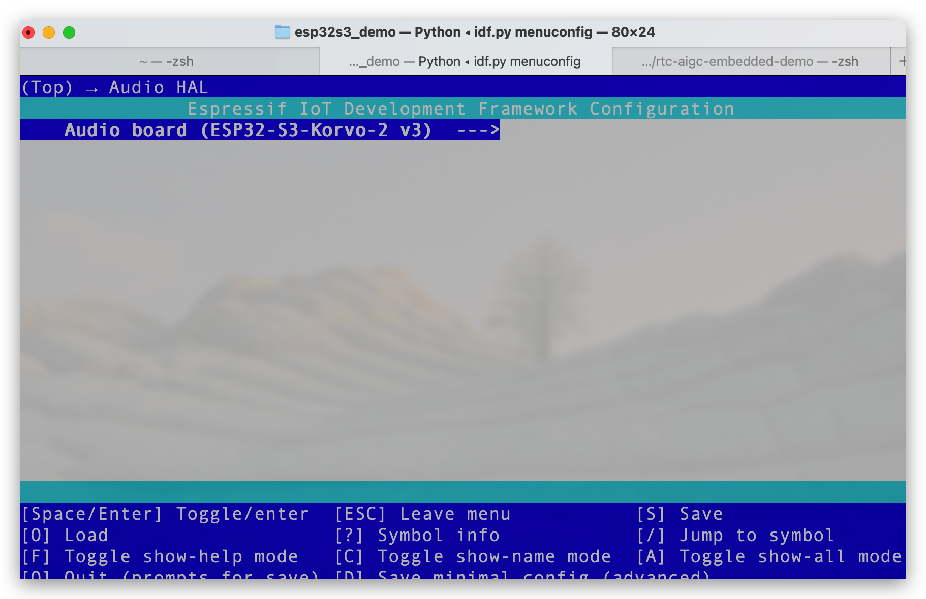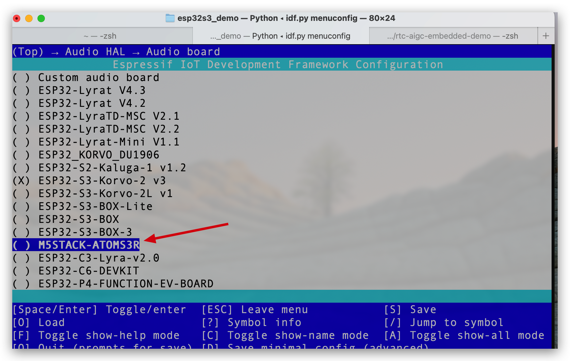 进入 Audio HAL 菜单,在 Audio board 中选择你的开发板型号。(例如: 方舟开发板选择 M 5 STACK-ATOMS 3 R) 保存并退出配置菜单