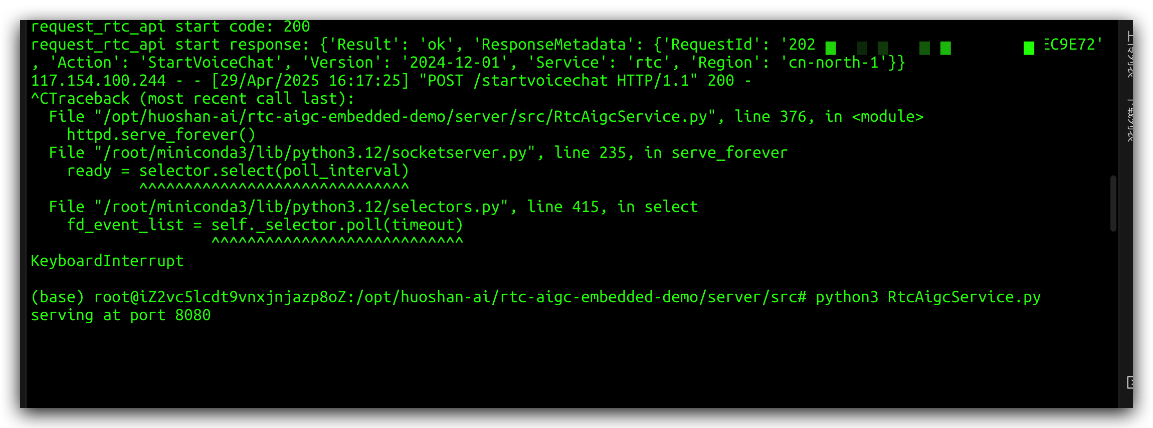 4、需要更改一下 RtcAigcService. py 文件,现在官方的 demo 还没更新,你可以用我的这个代码,只需要调整 161 行代码的值为自己的 token。