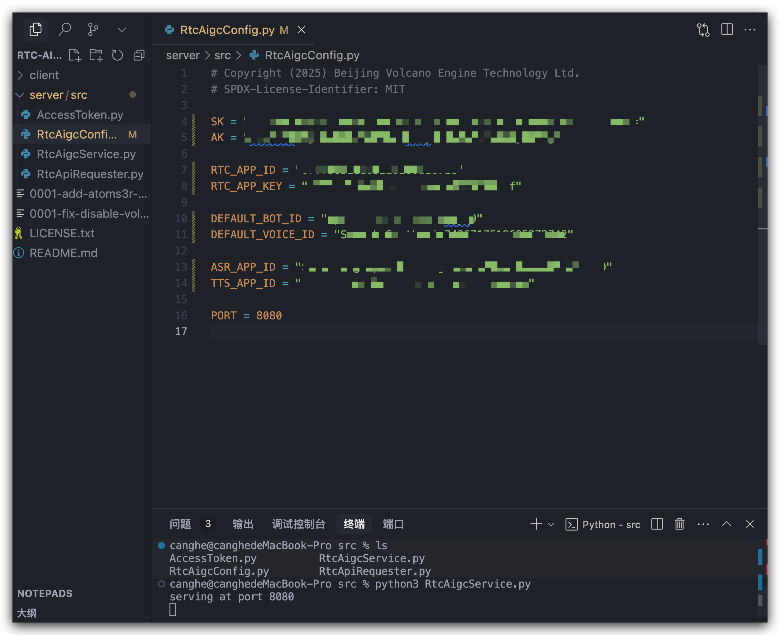 进入服务端配置文件 rtc-aigc-embedded-demo/server/src/RtcAigcConfig. py,设置如下参数: