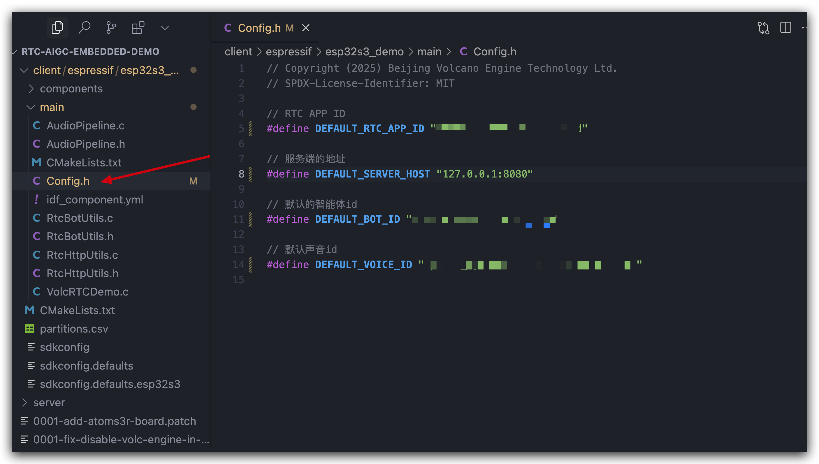 2、打开设备端配置文件 rtc-aigc-embedded-demo/client/espressif/esp 32 s 3_demo/main/Config. h,设置如下参数