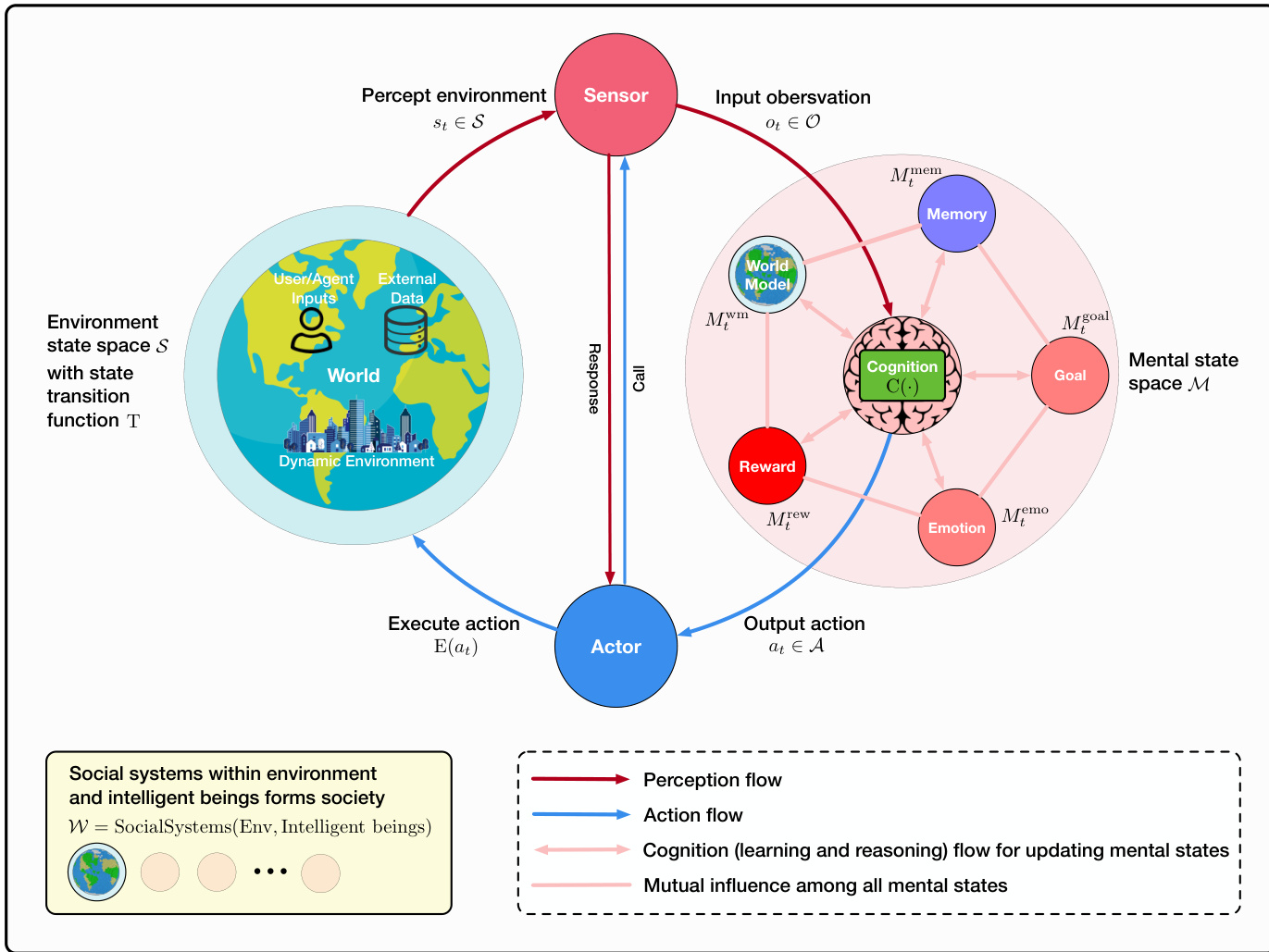 | Mₜ ∈ M | 智能体在时刻 t 的心理状态,包含子组件(记忆、情感等)。 |