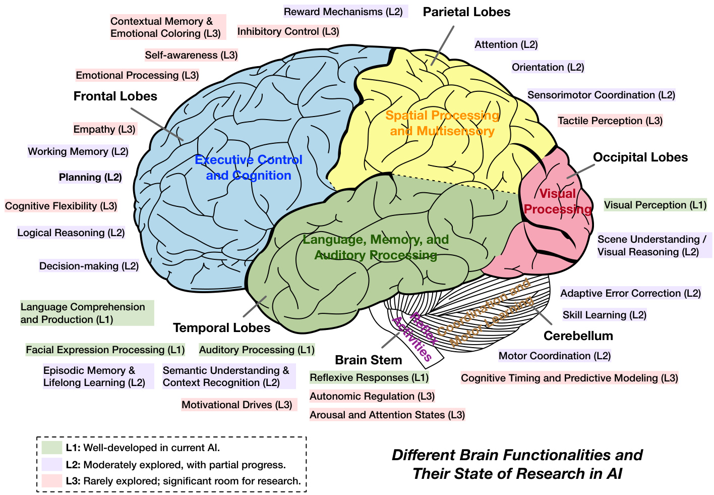 额叶:执行控制与认知 额叶,特别是前额叶皮层,对于高级认知功能至关重要,如规划(L2)、决策(L2)、逻辑推理(L2)、工作记忆(L2)、自我意识(L3)、认知灵活性(L3)和抑制控制(L3)[13]。AI在明确定义的领域内的规划和决策方面取得了显著进展,例如AlphaGo等AI智能体所展示的[14]。Transformer使用类似于人类工作记忆的注意力机制[15],但在灵活性和鲁棒性方面仍不及人类。AI中对真正自我意识和抑制控制的探索仍然稀缺,并且由于潜在的伦理和安全影响,建议谨慎行事。