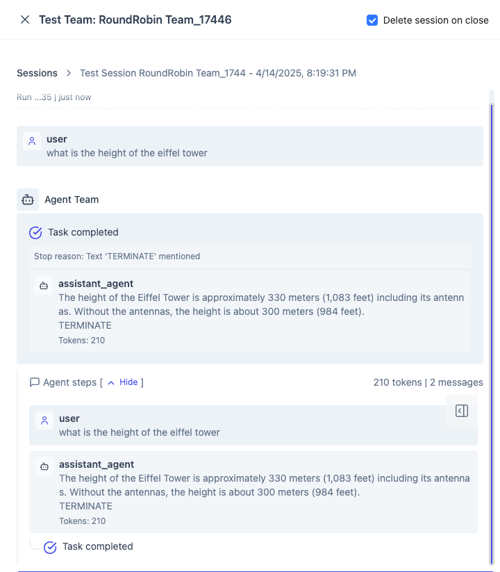 TaskResult(messages=[TextMessage(source='user', models_usage=None, metadata={}, content="Say 'Hello World!'", type='TextMessage'), TextMessage(source='assistant', models_usage=RequestUsage(prompt_tokens=33, completion_tokens=7), metadata={}, content='Hello World! \n\nTERMINATE', type='TextMessage')], stop_reason=None)