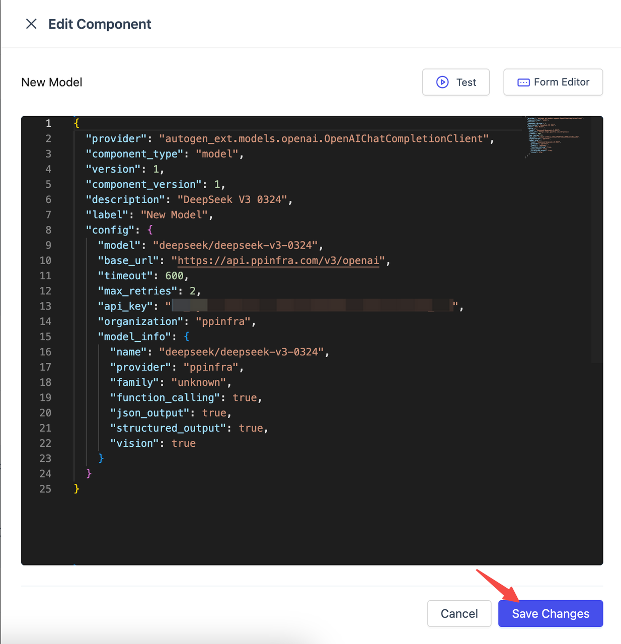 在右侧弹框中,点击【JSON Editor】切换到 JSON 编辑器来配置自定义模型,拷贝下方代码配置到编辑器,并点击【Save Changes】来保存模型配置: