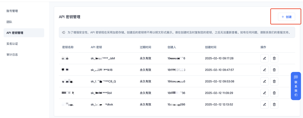 !!注意:密钥在服务端是加密存储,请在生成时保存好密钥;若遗失可以在控制台上删除并创建一个新的密钥。
