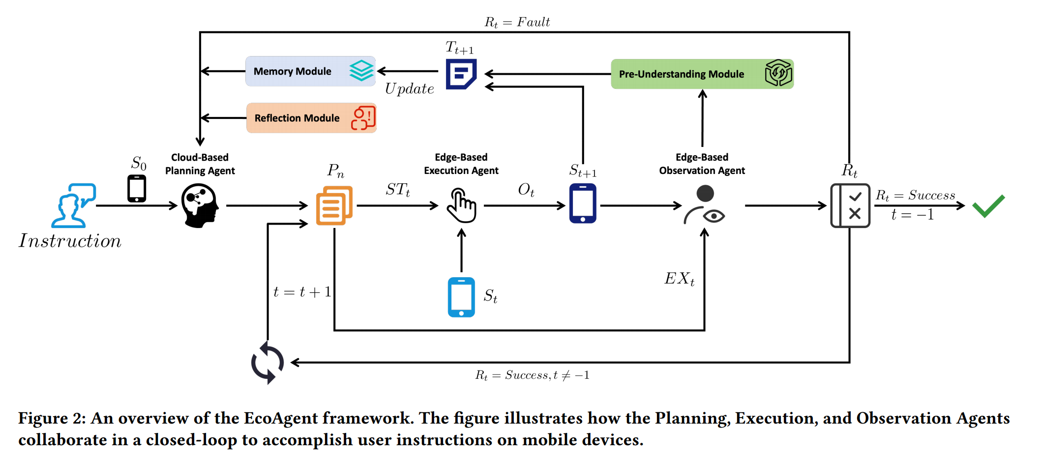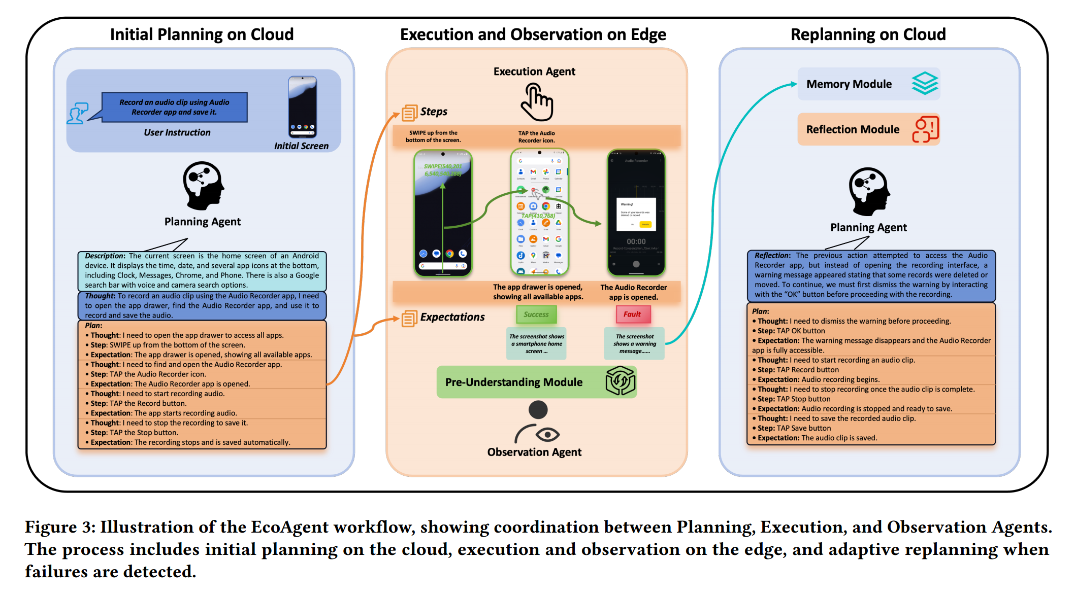 EcoAgent在三个代理之间形成闭环交互:基于云的规划代理和基于边缘的执行和观察代理。