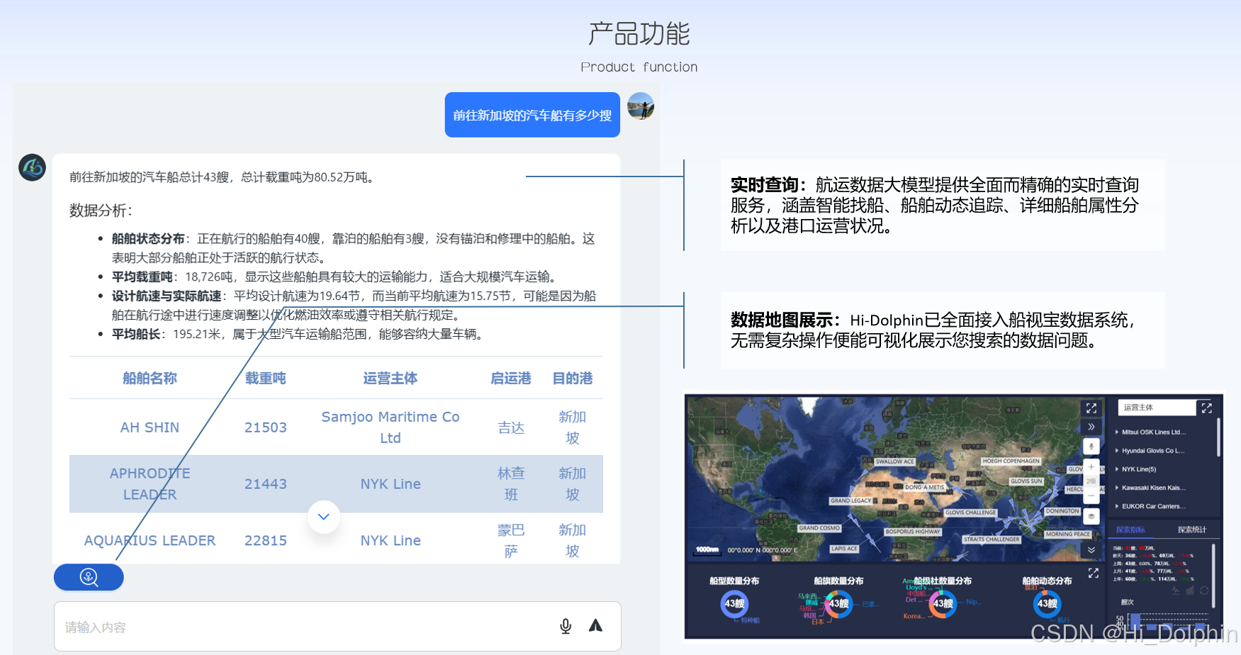 航运动态“全球通”:Hi-Dolphin打通船视宝数据接口,智能识别用户需求,调取最佳相关工具API,具备全球航运数据接入能力,实时汇集船舶位置、港口动态、天气预报、航线规划等关键数据,帮您一句话获取全球航运实时数据;