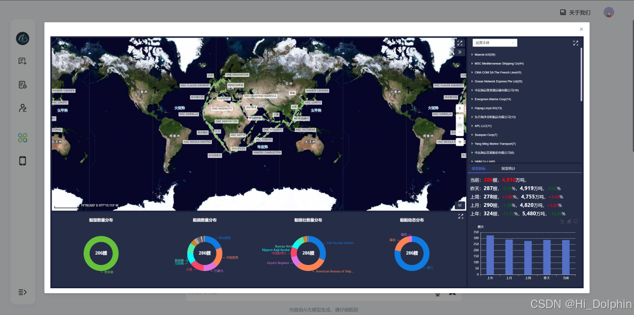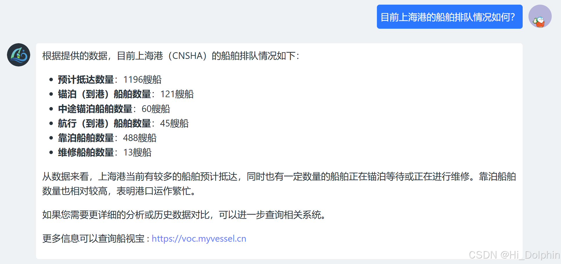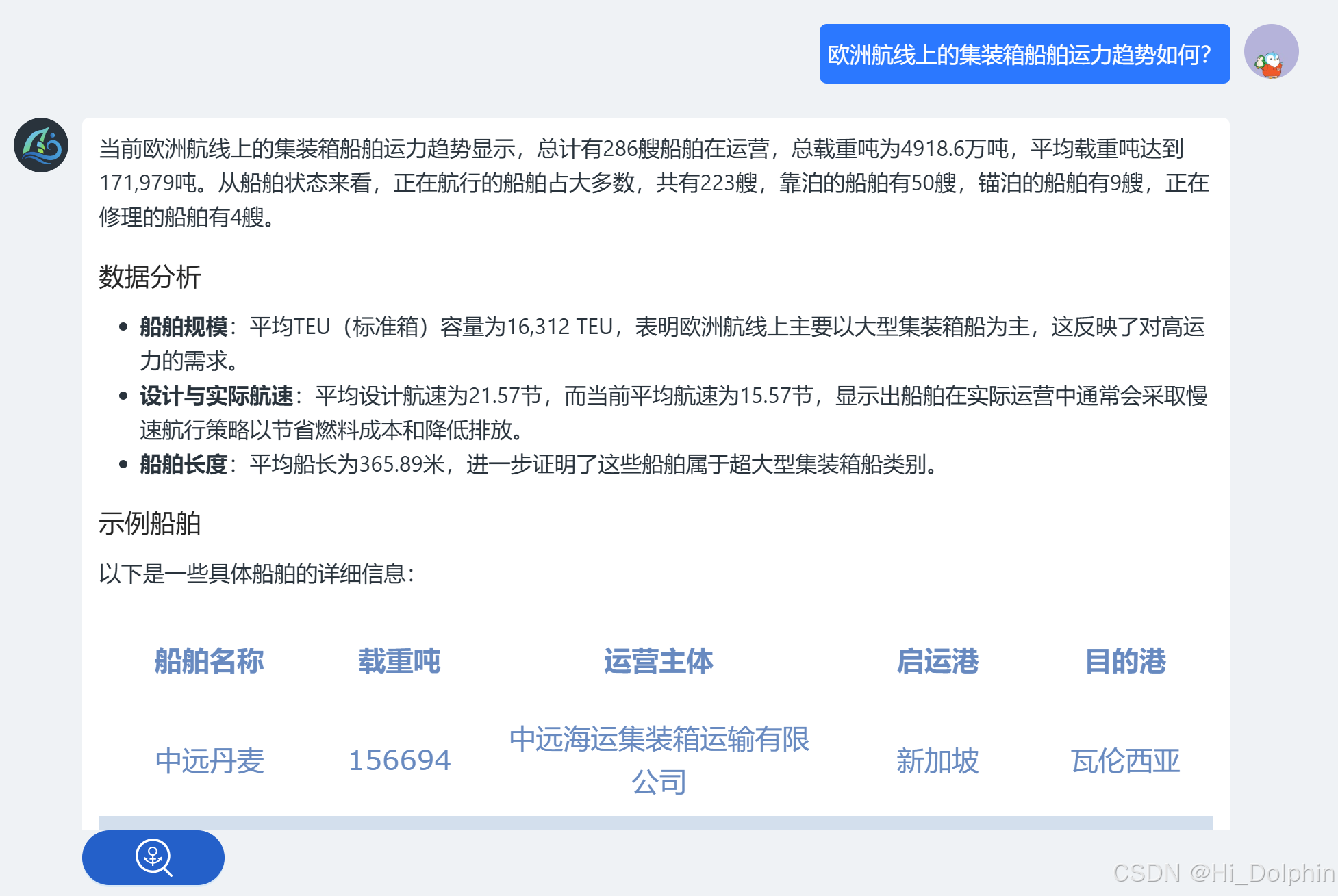 智能问答:智能语义查询作为Hi-Dolphin正式版的一大功能亮点,支持自然语言界面(NLI)的人机交互模式。用户只需在一个窗口,就可以完成海事类知识查询、航运数据调取、运力趋势分析等操作。让Hi-Dolphin成为您的贴心航运助手;