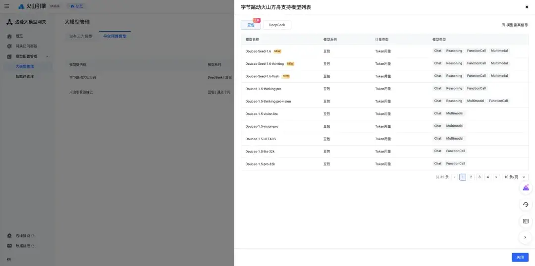 - 一是通过平台预置模型, 边缘大模型网关预置模型中,新增豆包 大模型 1.6 系列,您可直接使用并对其创建网关访问密钥;