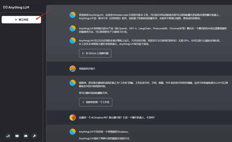 至此,一个AI驱动的本地私有知识库的基本架构已经搭建完成。接下来我们需要创建工作区,上传各种文档格式的企业私有数据,验证是否能正常工作。
