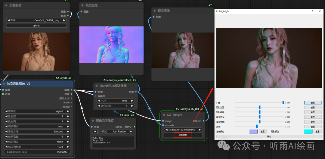 接下来我们来看看完整的工作流,主要节点就是「LG_Relight」,第一次点击执行工作流的时候会自动跳转 LG_Relight 的操作界面,后续如果要更新打光操作,点击节点上的「Update」就会重新换出该界面。