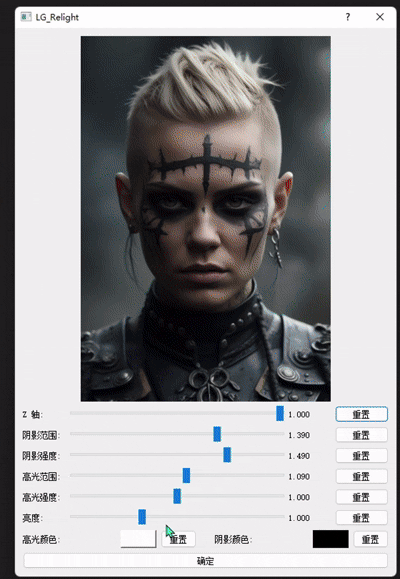 基础打光效果,总共有六个参数可以调整,包括 Z轴、阴影范围、阴影强度、高光范围、高光强度、亮度。这个节点是可以直接在 ComfyUI 中进行操作的。