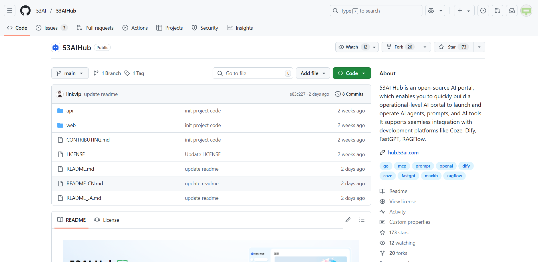 今天逛GitHub的时候,发现一个超有潜力的开源项目:53AI Hub。