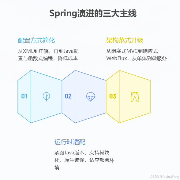 - 配置方式简化:从 XML 到注解,再到 Java 配置与函数式编程,持续降低开发成本。