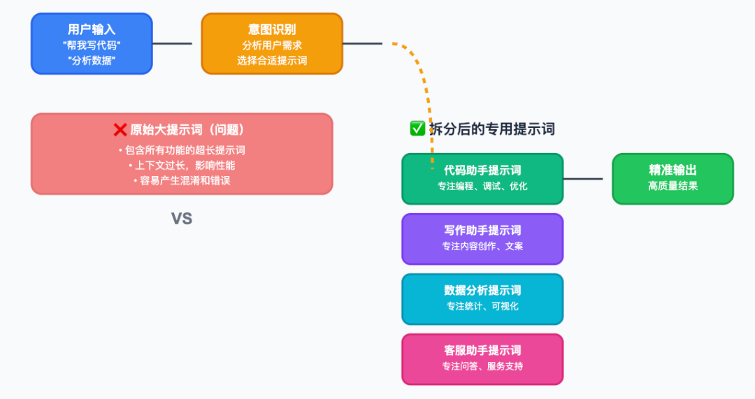 我们将一个提示词拆分成多个场景中的提示词,通过一个前置的意图识别来判断到底应该调用哪个提示词。