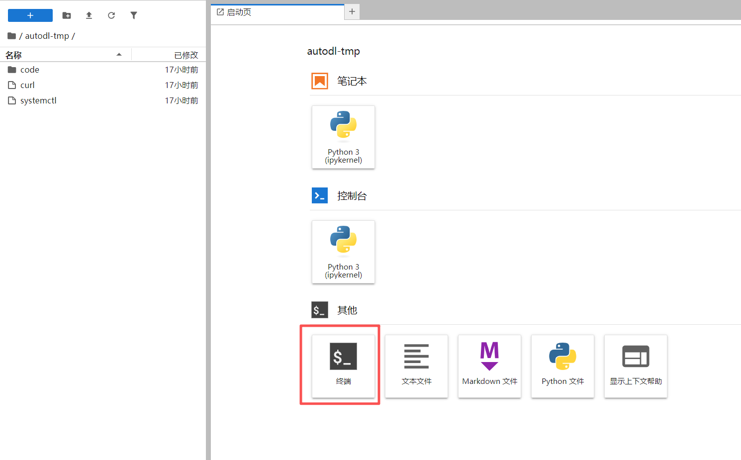 点击已购买实例的 快捷工具 -> JupyterLab,即可进入 autodl 实例的 jupyter。