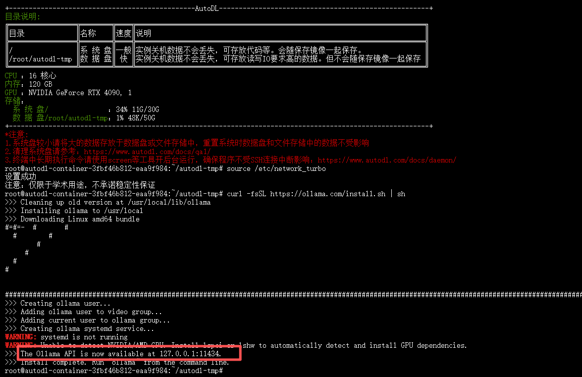 点击已购买实例的 快捷工具 -> JupyterLab,即可进入 autodl 实例的 jupyter。执行安装命令,以qwen3-8b为例 ollama pull qwen3:8b注意是英文逗号。2、在镜像选择基础镜像 -> pytorch 2.5.1 即可,然后点击创建并开机。点击右上角的控制台,即可进入控制台,点击左侧实例列表即可进入列表,开机。在终端中执行以下命令,打开学术加速(非常重要,