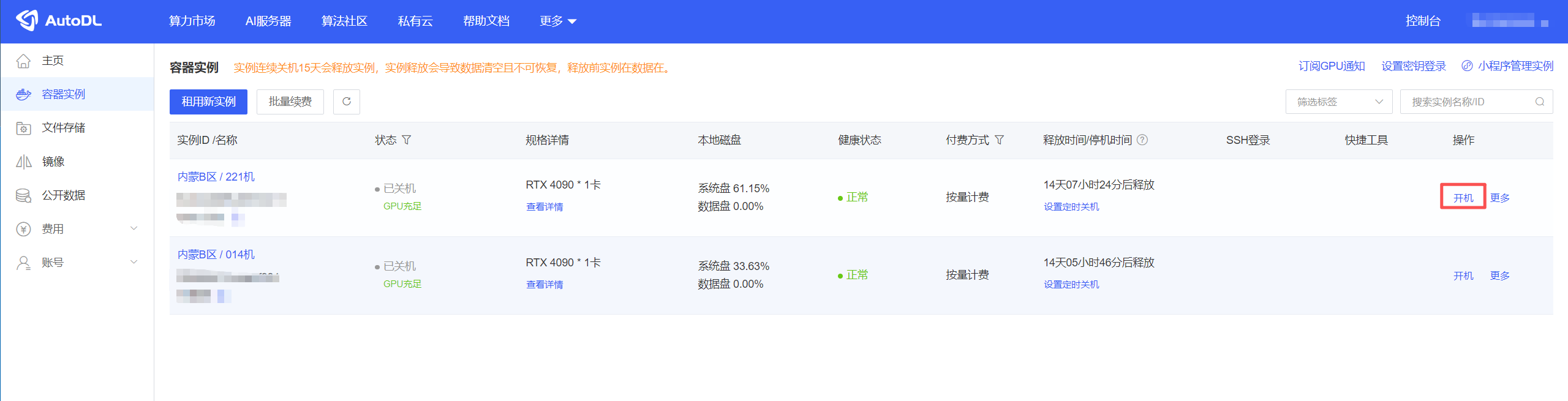 点击右上角的控制台,即可进入控制台,点击左侧实例列表即可进入列表,开机