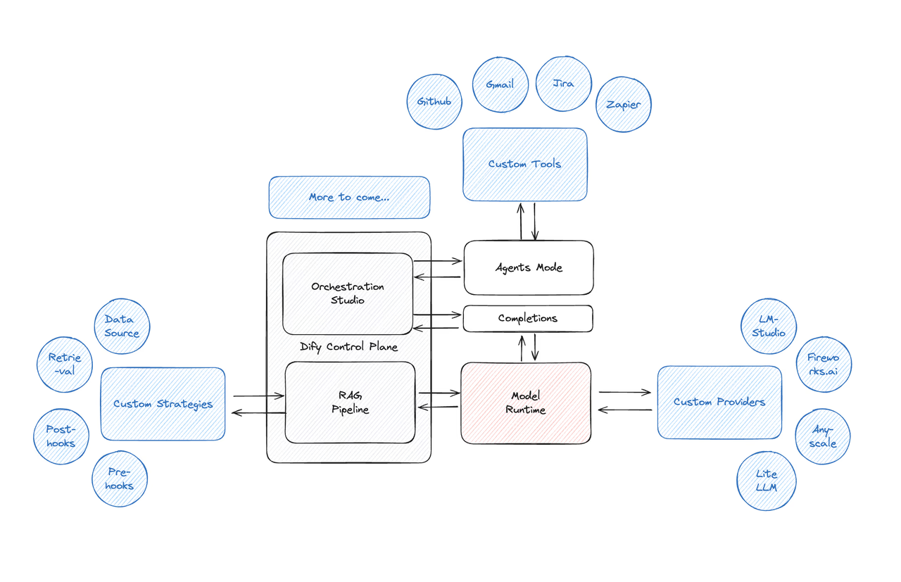 这张图展示了 Dify 的 Beehive 架构。各核心模块(对话系统、RAG、插件、模型运行时)可独立部署、水平扩展,但通过统一的 API 层实现高度协同。