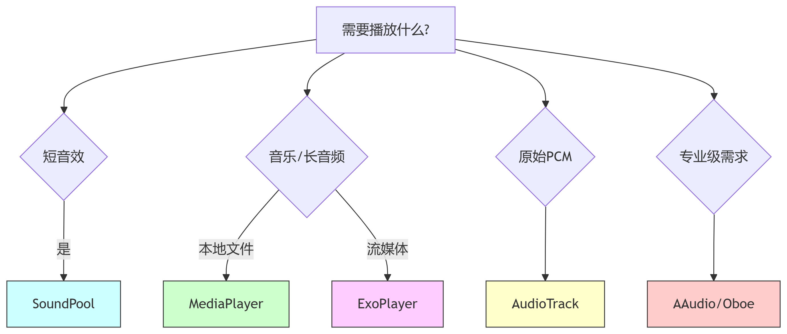 Android提供了多层次的音频播放API,覆盖从简单播放到专业音频处理的各种需求: