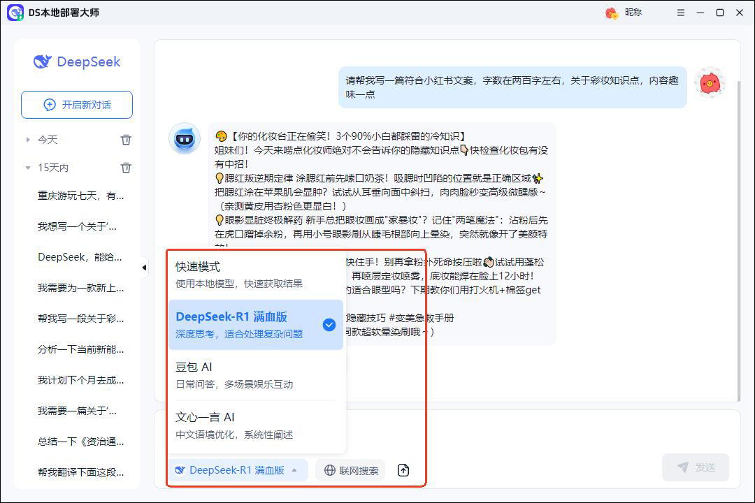 随后,在软件的输入框中输入想咨询的问题,点击“发送”模型就会快速给出回答。还可以进行模型切换,如deepseek满血版、豆包等,让使用体验更贴合需求。