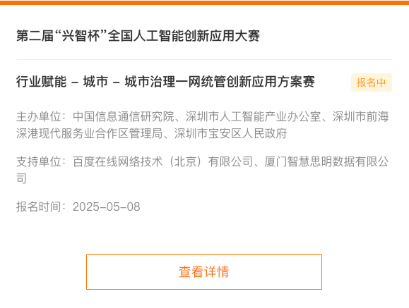 为进一步发挥“以赛促研、以赛促用、以赛育人”的作用,第二届兴智杯大赛如约而至,大赛由中国信息通信研究院、深圳市人工智能产业办公室、深圳市前海深港现代服务业合作区管理局、深圳市宝安区人民政府主办,旨在聚焦技术创新和应用赋能面临的痛点、难点,加速人工智能技术创新和产业化落地,培育一批国内外优秀人工智能创新人才,为优秀项目提供展示、推广的平台。