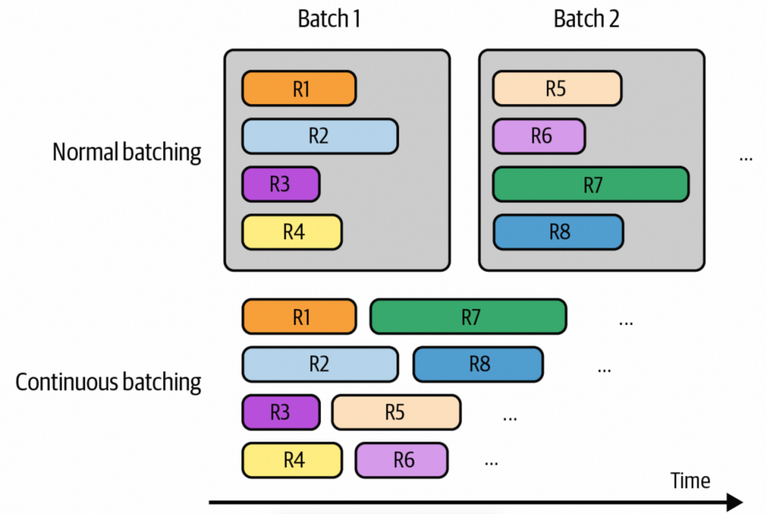 连续批处理,简单理解有点像多线程处理,每个批处理渠道都有自己的处理任务,如下图所示,比如有4个并行处理的通道,每个处理通道相互独立,每次处理一个请求,请求处理完成之后,可以做立刻返回,然后接着处理下一个请求。