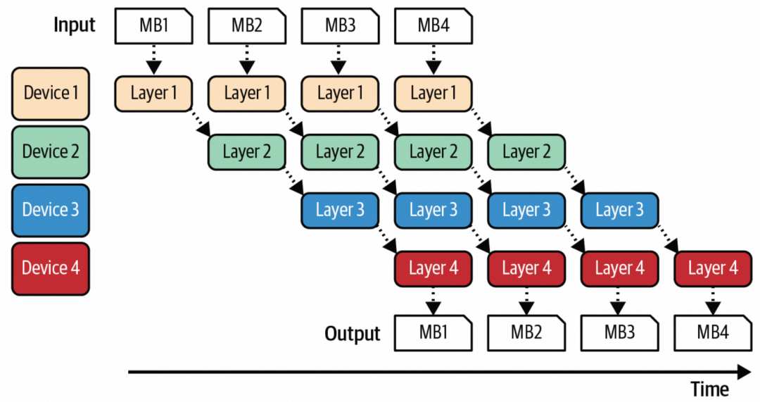 Pipeline Parallelism,就是把整体的推理过程进行步骤的拆分,每个步骤都可以以流水线的形式并行处理;