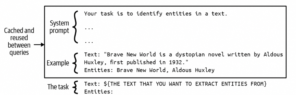 还有一种是缓存不同Prompt中的相同部分,比如Prompt中的system prompt、examples(few-shot或many-shot),如下图所示,可以将System prompt和few-shot对应的分词编码后的结果进行缓存,在每次query调用的时候,从缓存中直接读取,拼接上User Prompt部分内容,再输入给LLM。