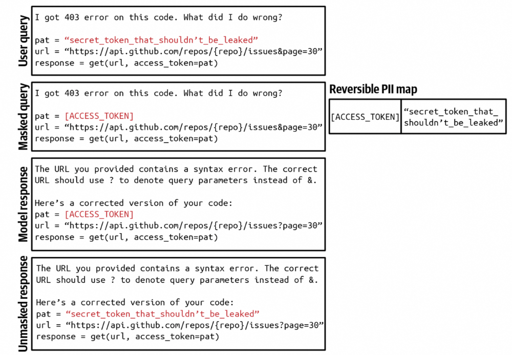 用户隐私泄漏相关的防护,比较通用的做法是针对用户的query输入,在给到LLM(特指三方大模型服务,内部模型隐私问题会轻量很多)之前,通过一些特定的工具来识别用户隐私类信息,比如用户身份证id、手机号、银行卡号、人脸信息、一些密钥之类的信息,识别到之后做脱敏,可见下面的例子,是把用户的prompt中的Access Token做了安全替换: