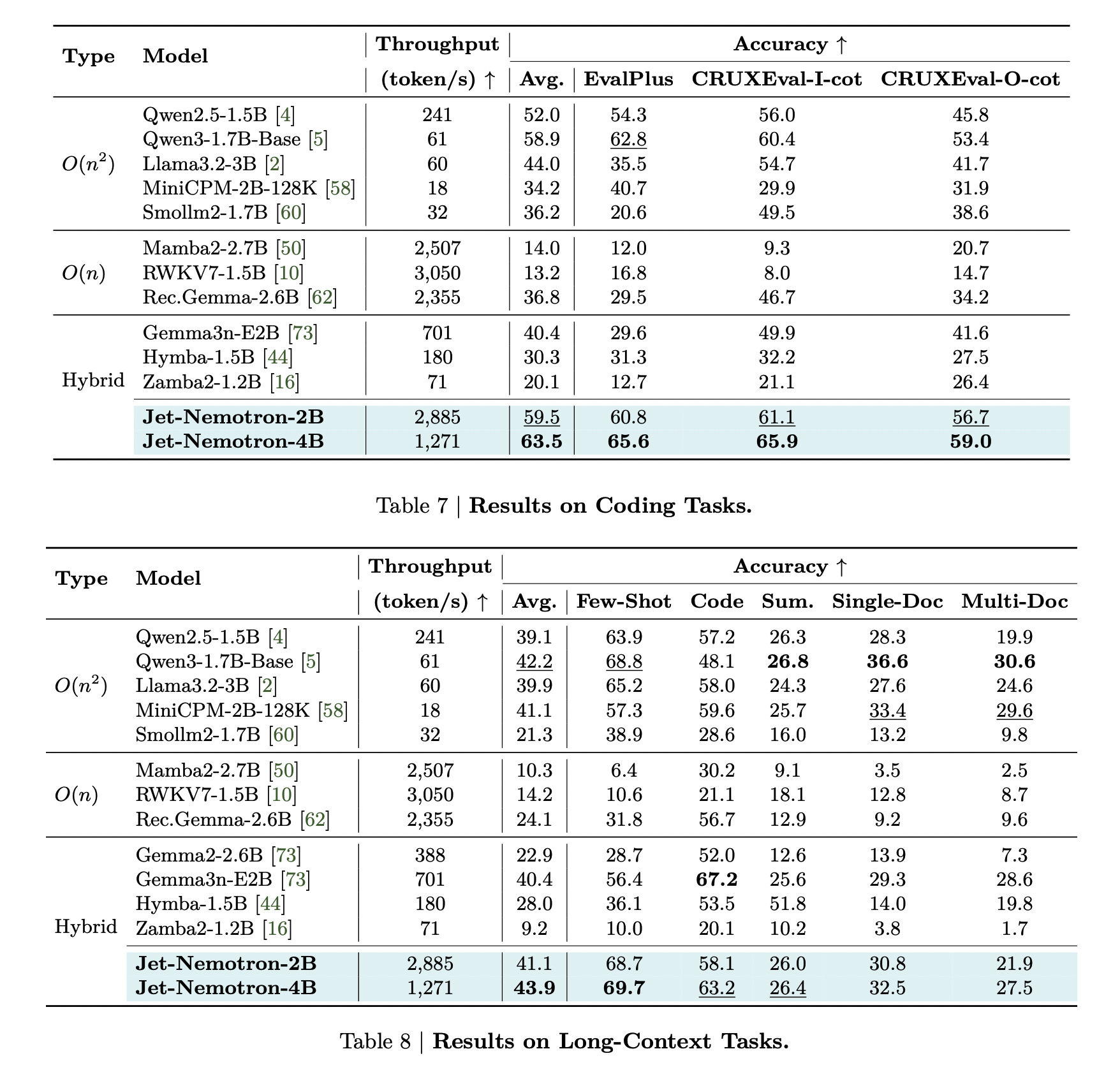 编码任务上的结果。表 7 显示了编码任务的结果。Jet-Nemotron-2B 的平均准确率高于所有基线。Jet-Nemotron-4B 在所有编码任务中实现了更高的准确率,同时在生成吞吐量上相对于 Qwen3-1.7B-Base 等领先 LM 仍具有巨大优势。