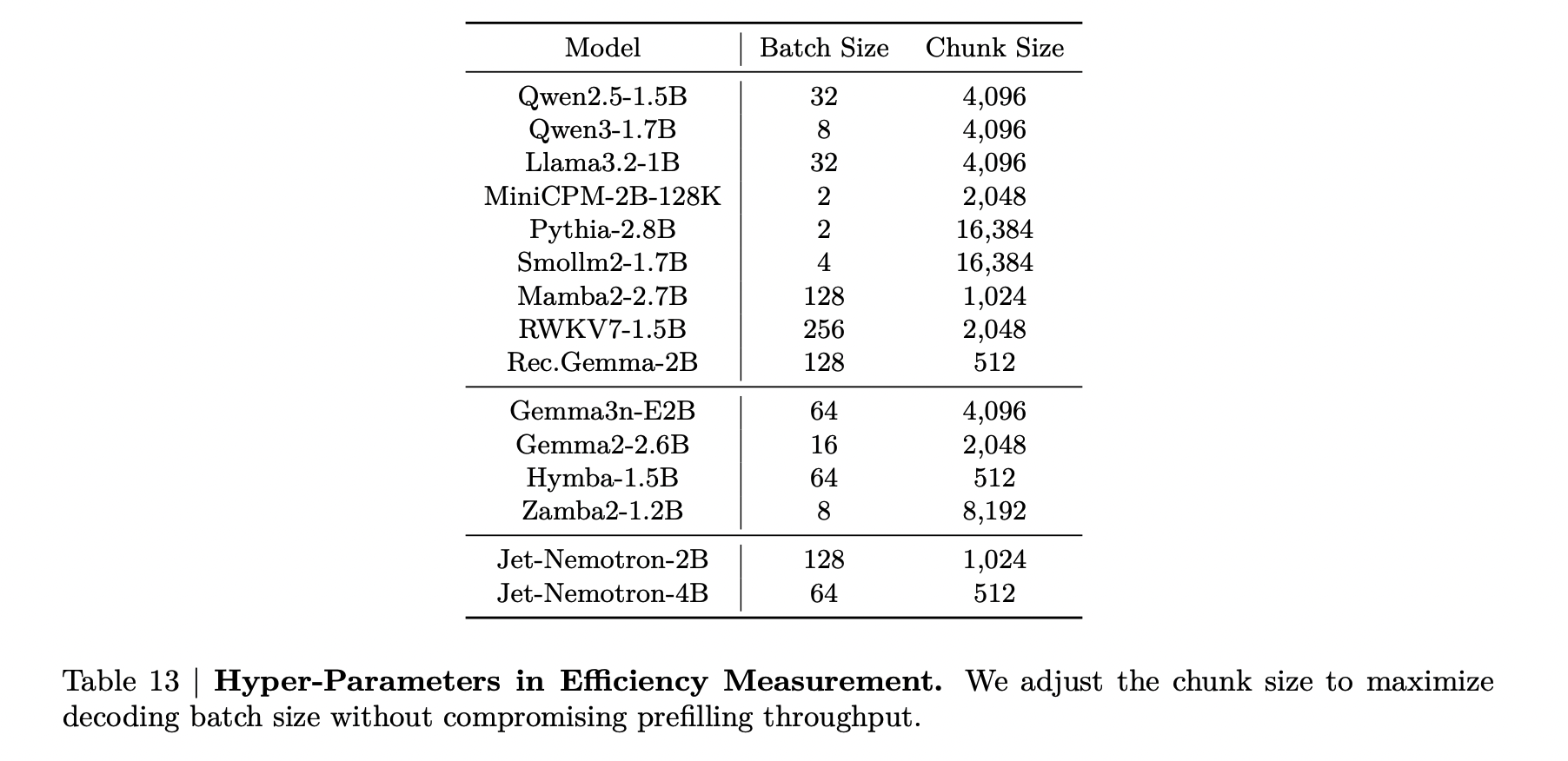 在整个实验中,我们在单个 H100 GPU 上测量了 Jet-Nemotron 和基线模型可达到的最大预填充和解码吞吐量。这是通过调整分块预填充 [72] 中的分块大小来实现的,以在不牺牲预填充吞吐量的前提下最大化解码批处理大小。我们在表 13 中列出了每个模型的优化后批处理大小及相应的分块大小。预填充上下文长度为 64K。由于 KV 缓存内存主导了推理过程中的 GPU 使用量,通过减少每个序列的内存占用,更小的缓存允许更多序列被并行处理,从而极大地提升了生成吞吐量。