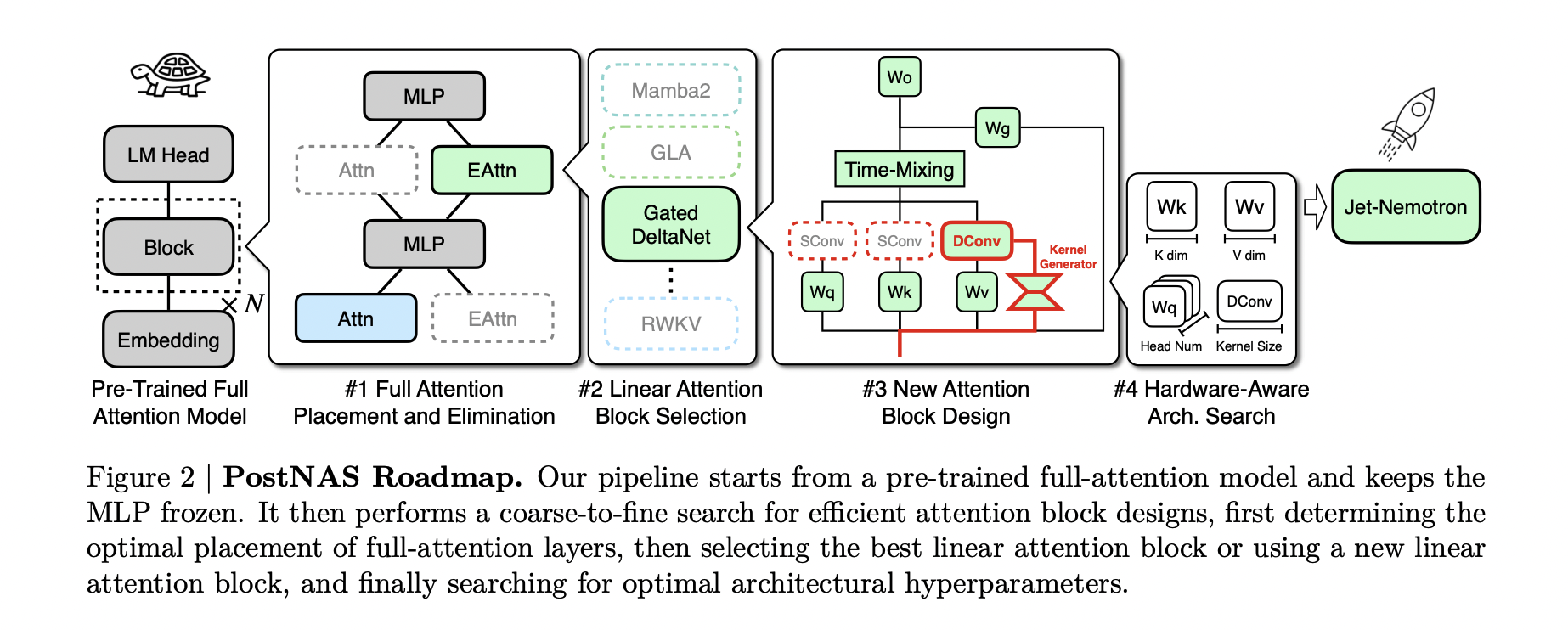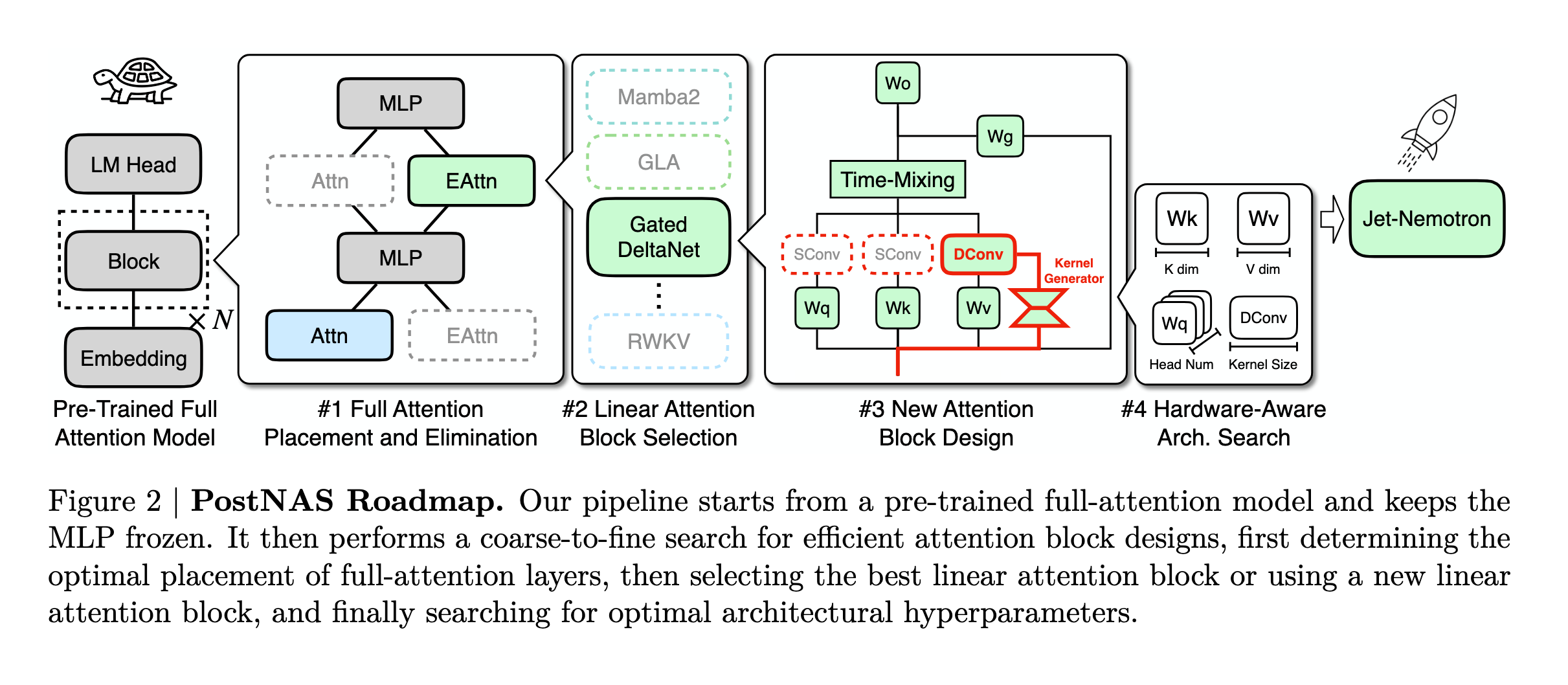 Jet-Nemotron 基于后神经架构搜索(PostNAS)构建,这是一种新颖的神经架构探索流程(图 2),能够快速设计高效的模型架构。与主流的 LM 架构设计方法不同,PostNAS 从一个预训练的全注意力模型开始,从中继承多层感知机(MLP)权重并在整个过程中保持冻结。这一策略显著降低了训练成本,同时仍允许对注意力块进行全面探索。该流程随后通过四个关键步骤系统地搜索最优的注意力块设计。
