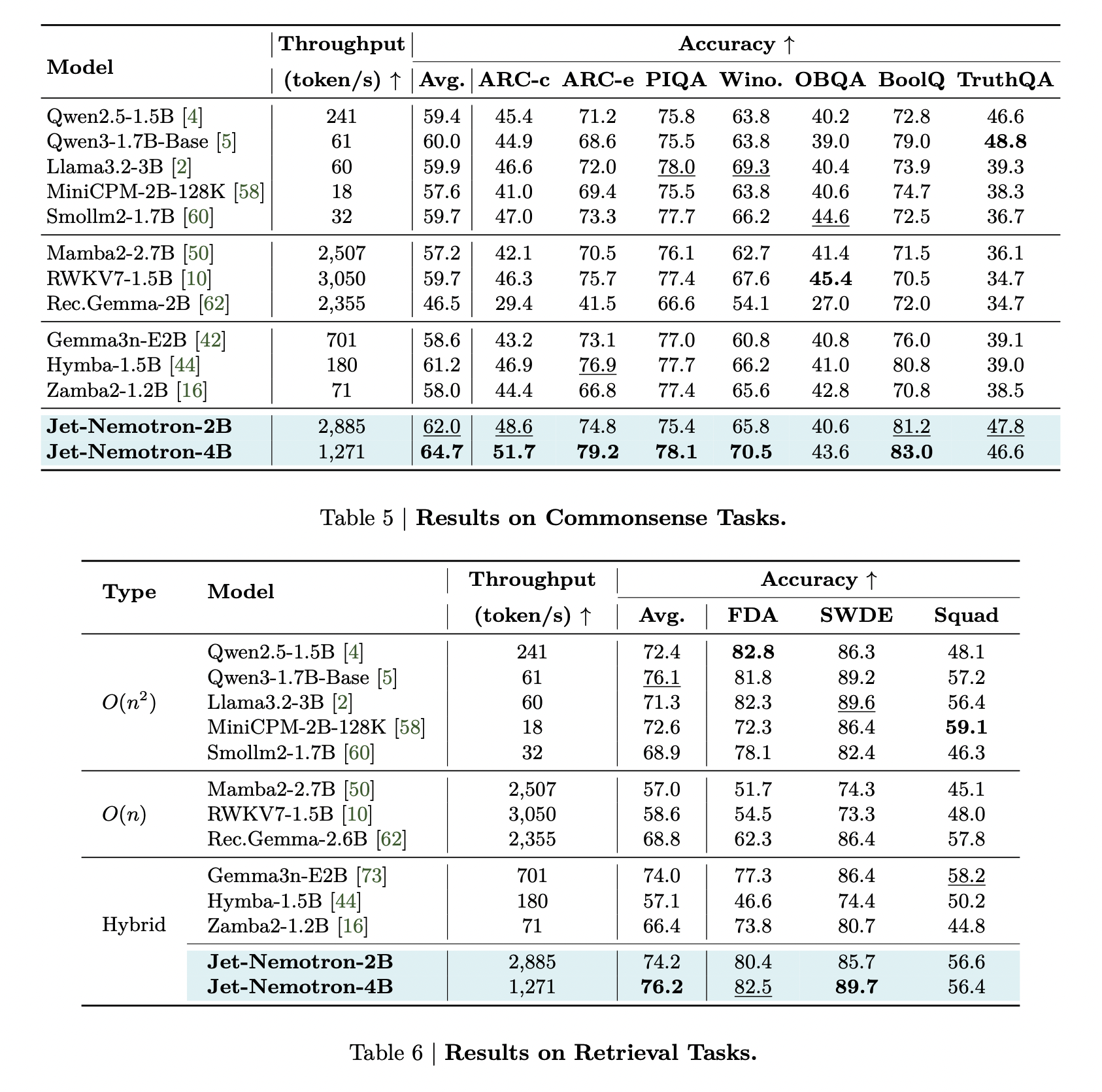 检索任务上的结果。表 6 展示了检索任务的结果。Jet-Nemotron-2B 优于除 Qwen3-1.7B-Base 之外的所有基线。当扩展到 40 亿参数时,Jet-Nemotron-4B 实现了 76.2 的最佳平均准确率,同时与 Qwen3 相比仍保持 21 倍的加速。