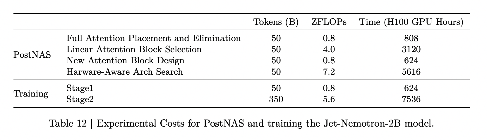 表 12 总结了 PostNAS 和训练 Jet-Nemotron-2B 模型的成本。我们并行使用了 32 个 H100 GPU。报告的 GPU 小时数已计入设备总数。